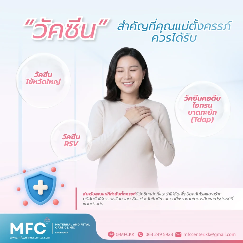 MFC Clinic คลินิกเวชศาสตร์มารดาและทารกในครรภ์ที่ขอนแก่น มีบริการฉีดวัคซีนสำหรับคุณแม่ตั้งครรภ์ครบทั้ง 3 ชนิด ได้แก่ วัคซีนไข้หวัดใหญ่ วัคซีนบาดทะยักตั้งครรภ์รวมกับคอตีบและไอกรน และวัคซีน RSV โดยแพทย์ผู้ชำนาญการด้านเวชศาสตร์มารดาและทารกในครรภ์จะให้คำแนะนำและดูแลตามอายุครรภ์ที่เหมาะสมของคุณแม่แต่ละคน พร้อมบริการตรวจติดตามสุขภาพแม่และเด็กอย่างใกล้ชิดตลอดการตั้งครรภ์ด้วยมาตรฐานการดูแลที่ใส่ใจในทุกรายละเอียด หากสนใจสามารถติดต่อสอบถามเพื่อนัดหมายและรับคำปรึกษาเพิ่มเติมได้
